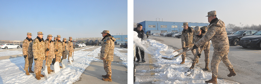 2023年第一场大雪后,寒风凛冽,风雪无情,路面积雪严重影响着的出行,特别是安达物流院内,天气寒冷,再加上积雪路面因车辆的反复驶过已造成积雪成冰,虽然物流工作人员经过一周的清理,但还是有一大部分路面未完全清理干净。天气寒冷却阻碍不了军民共建的爱心驻区93688部队52分队作为安达集团的双拥共建单位,了解到安达物流因积雪造成的作业困难、安全无保障的困境,立马提出主动帮助物流公司清理院内积雪。